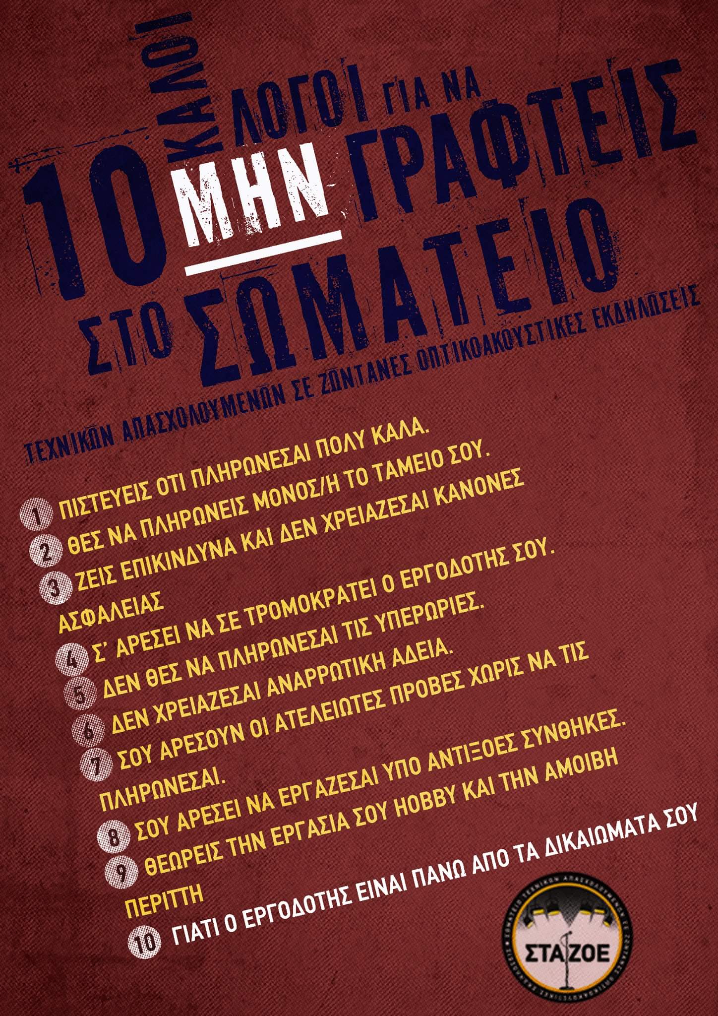 Όπως καταλαβαίνετε, αυτό δεν αϕορά μόνο τα εκλεγμένα μέλη του Δ.Σ., αλλά όλους όσους απασχολούμαστε στο θέαμα/ακρόαμα, πράγμα το οποίο δηλώνει και το όνομα του σωματείου. Έχει έρθει η στιγμή να αϕήσουμε πίσω μας την λογική της ανάθεσης και τις παθογένειες του παρελθόντος και να συνδράμουμε όλοι αυτήν την προσπάθεια. Καλούμε όλες τις ειδικότητες που απασχολούνται στο θέαμα/ακρόαμα (ηχολήπτες, ϕωτιστές, τεχνικούς βίντεο, τεχνικούς σκηνής, κ.α.) να ενισχύσουν την προσπάθεια μας για την χαρτογράϕηση του επαγγέλματος μας και την πλήρη περιγραϕή των ειδικοτήτων μας. Διαθέστε λίγο από το χρόνο σας να σκεφτείτε τα χαρακτηριστικά της όποιας ειδικότητας σας και μέτα κάντε μια περιγραφή, με τα δικά σας λογια. Κατόπιν, στείλτε μας (stazoe.gr, stazoe.gr[at]gmail.com, ή στο inbox της σελίδας μας στο facebook) αυτήν την περιγραφή, έτσι ώστε να την χρησιμοποιήσουμε για την σύνταξη της ολοκληρωμένης χαρτογράφησης του κλάδου μας, που όταν ολοκληρωθεί θα αποσταλεί στο νομικό τμήμα του υπουργείου για να προχωρήσει η υπόθεση μας.