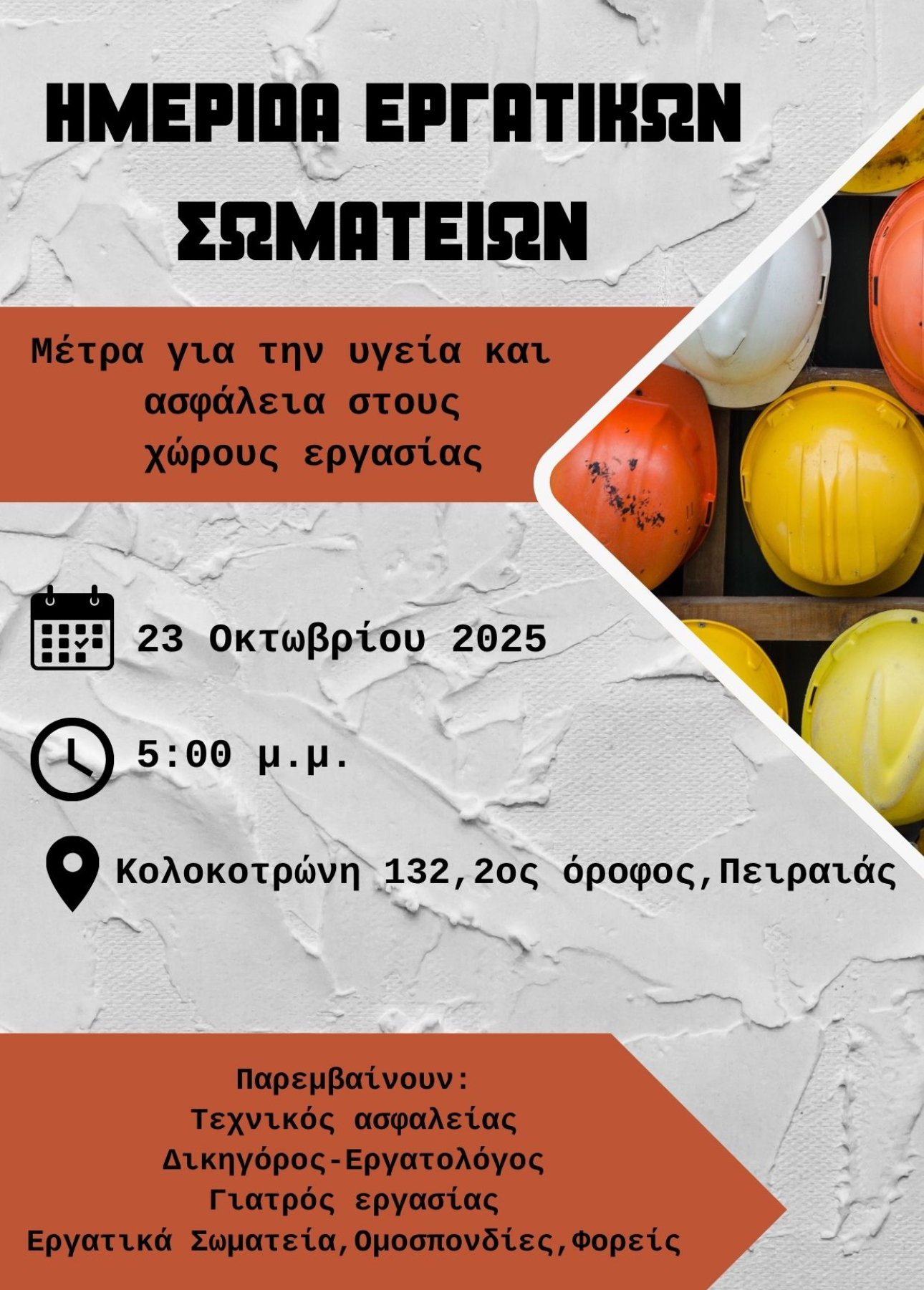 σας προσκαλούμε να συμμετάσχετε στην Ημερίδα των Σωματείων για την Υγεία και την Ασφάλεια στην Εργασία που θα πραγματοποιηθεί την Πέμπτη, 23 Οκτώβρη στις 17:00, Κολοκοτρώνη 132, 2ος όροφος, στον Πειραιά.